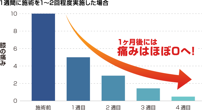 - ほとんどの方が1、2回目に大きく痛みの改善を実感して頂いています。その後も、練習をすれば少し痛みは戻りますが、次の施術の際には前回よりも施術前の膝の痛みは軽い状態になっています。