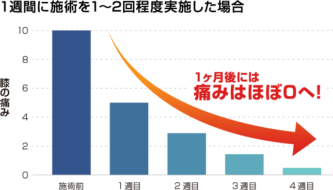 施術前の膝の痛みを10とした場合、施術のたびに膝の痛みが徐々に減っていることが見て取れます。