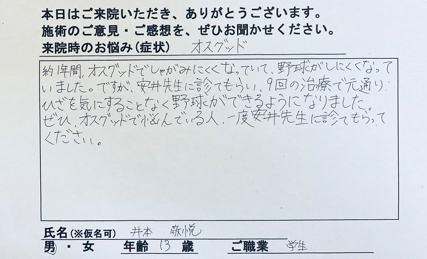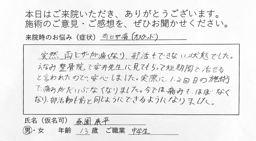 当院でオスグッド病専門の施術を受けることで痛みが改善し、今では痛みを気にせず、全力でスポーツに打ち込んでいます。