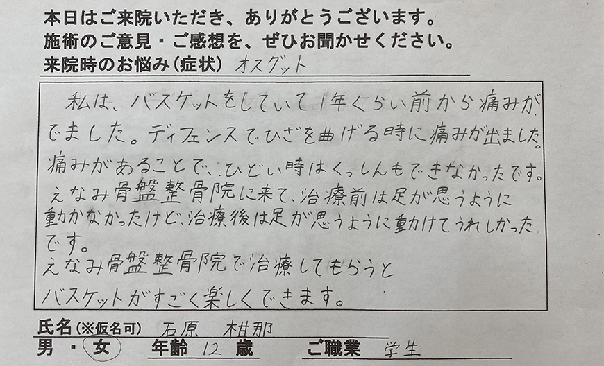 「1年前からの痛みがなくなり、思うように動けるように!」石原 柑那ちゃん(12才)・バスケットボール
