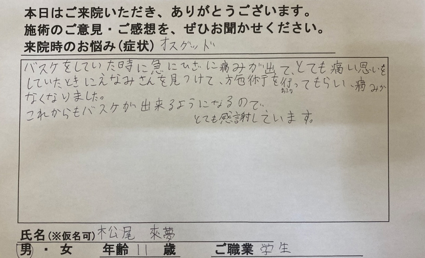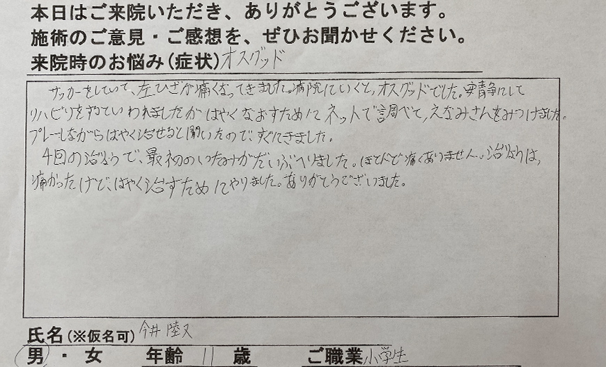 しかし、当院でオスグッド病の専門施術を受けた子たちは、「1,2回の施術で痛みが大きく改善しました!」と仰ってくれます。